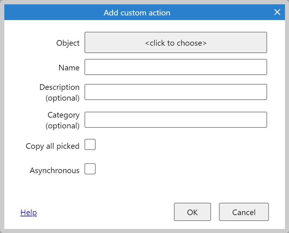 - By default custom actions run with only the same instances of the given object picked as the action that called it. Check Copy all picked to instead run the custom action with the same instances of all objects picked as the action that called it, much like the Copy picked setting for functions.