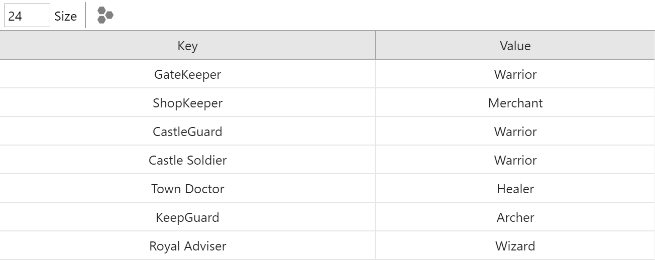 Initially the dictionary has a single item, which means there is just one row available. Use the Size setting to change how many items are available. This determines how many rows appear in the editor, allowing you to enter more data. Each row represents a key in the dictionary (in the left column) and its associated value (in the right column).