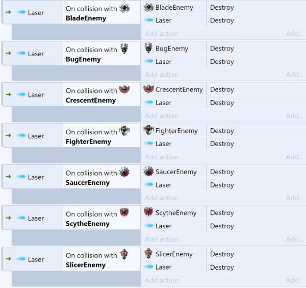 The Families example in Construct demonstrates the advantage of this. There are seven kinds of enemy, and they all need to be destroyed when the laser hits them. Without families, seven separate events are necessary, as shown below: