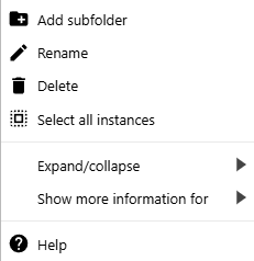 These options are shown when showing a context menu for an instance or group of instances. Some are equivalent to the context menu options with the same names found on context menus of the Layout View.