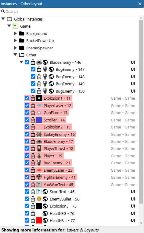 Instances highlighted in red are shown in the bar because they belong to the Game layout, but are not in any global layer in the current layout.