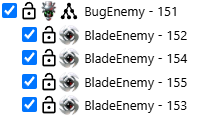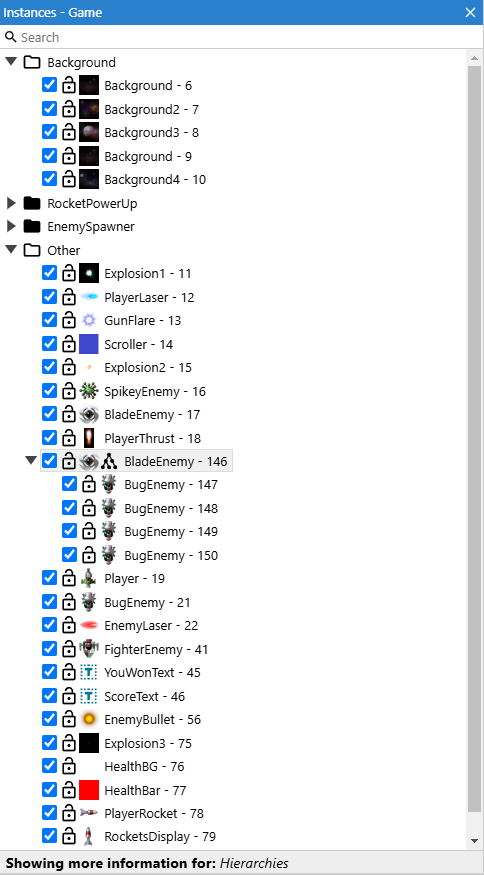 You can also use folders to group related instances together. Hierarchies are shown as a tree structure to quickly tell which instances are where in complex structures.