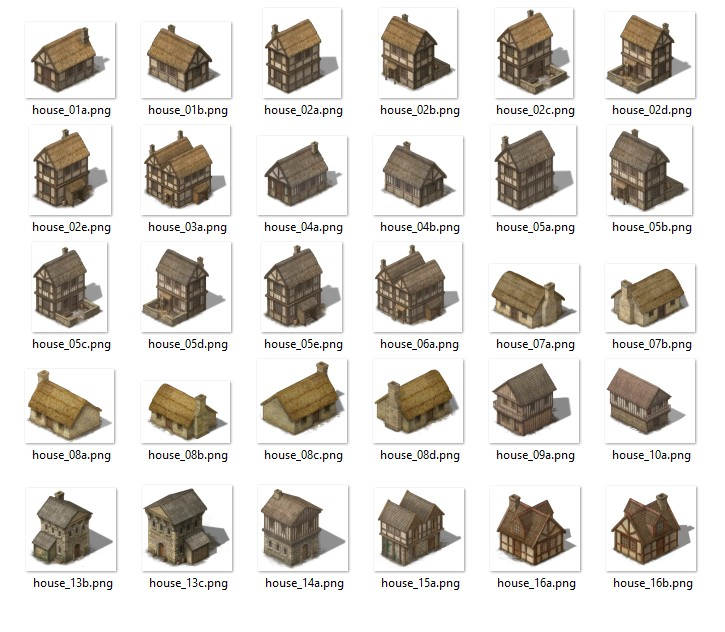 Over 200 isometric medieval style (European) buildings and objects sprites in .png format with alpha channel transparency.