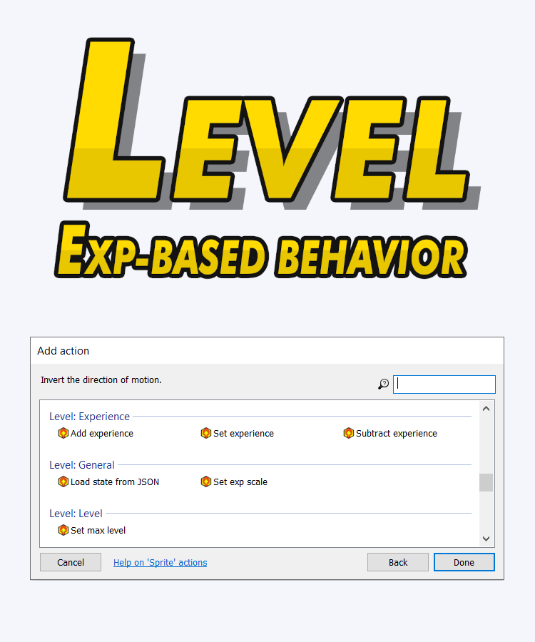 You simply add it to an object (e.g. sprite) same as other behaviors and set just a couple of properties like base experience, level progression pattern or a maximum level.