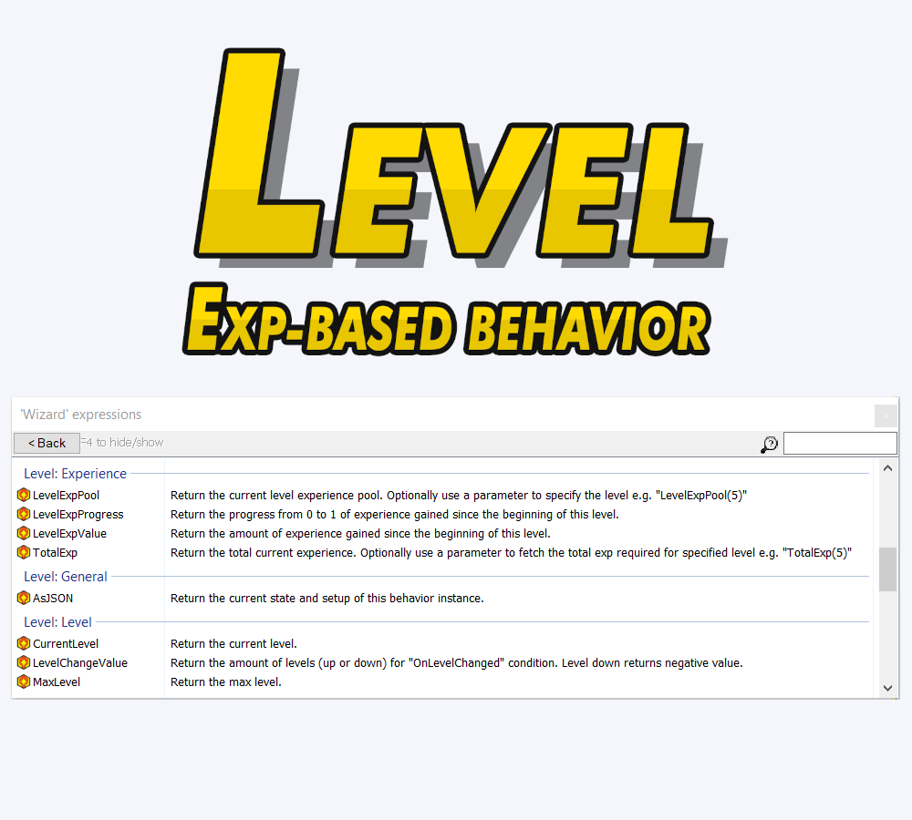 Level is a Construct behavior that serves as a tracker and manager of experience points and experience levels - a well known mechanic commonly used in role-play games as well as in other genres. It is a core mechanic of many games, almost a standard solution.