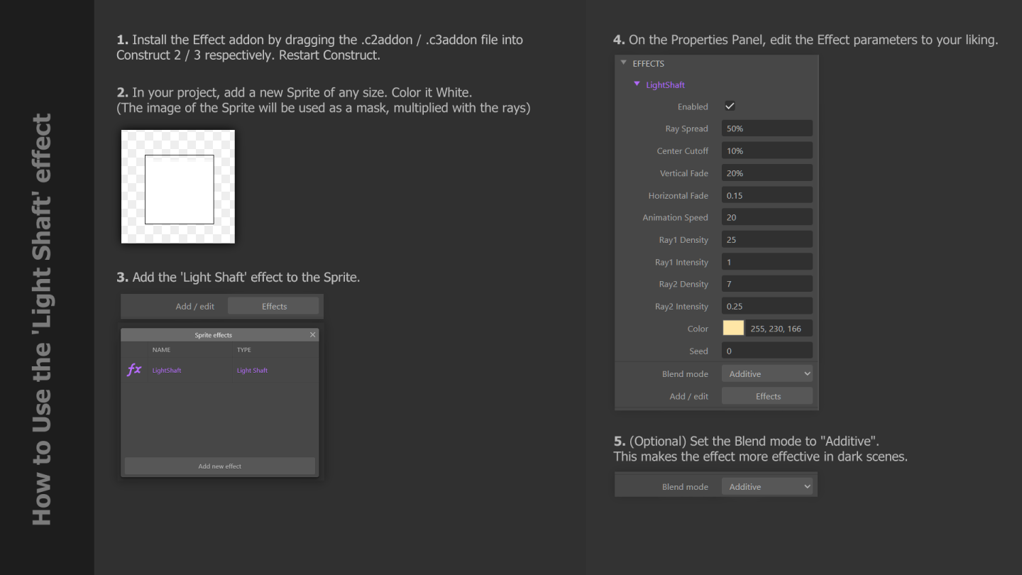 The Light Shaft effect creates dynamic "godrays" that flow and shimmer naturally using layered procedural noise.