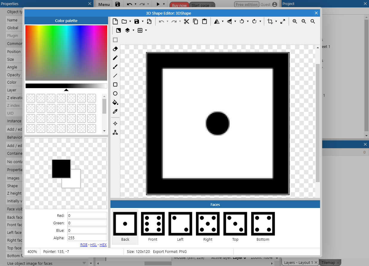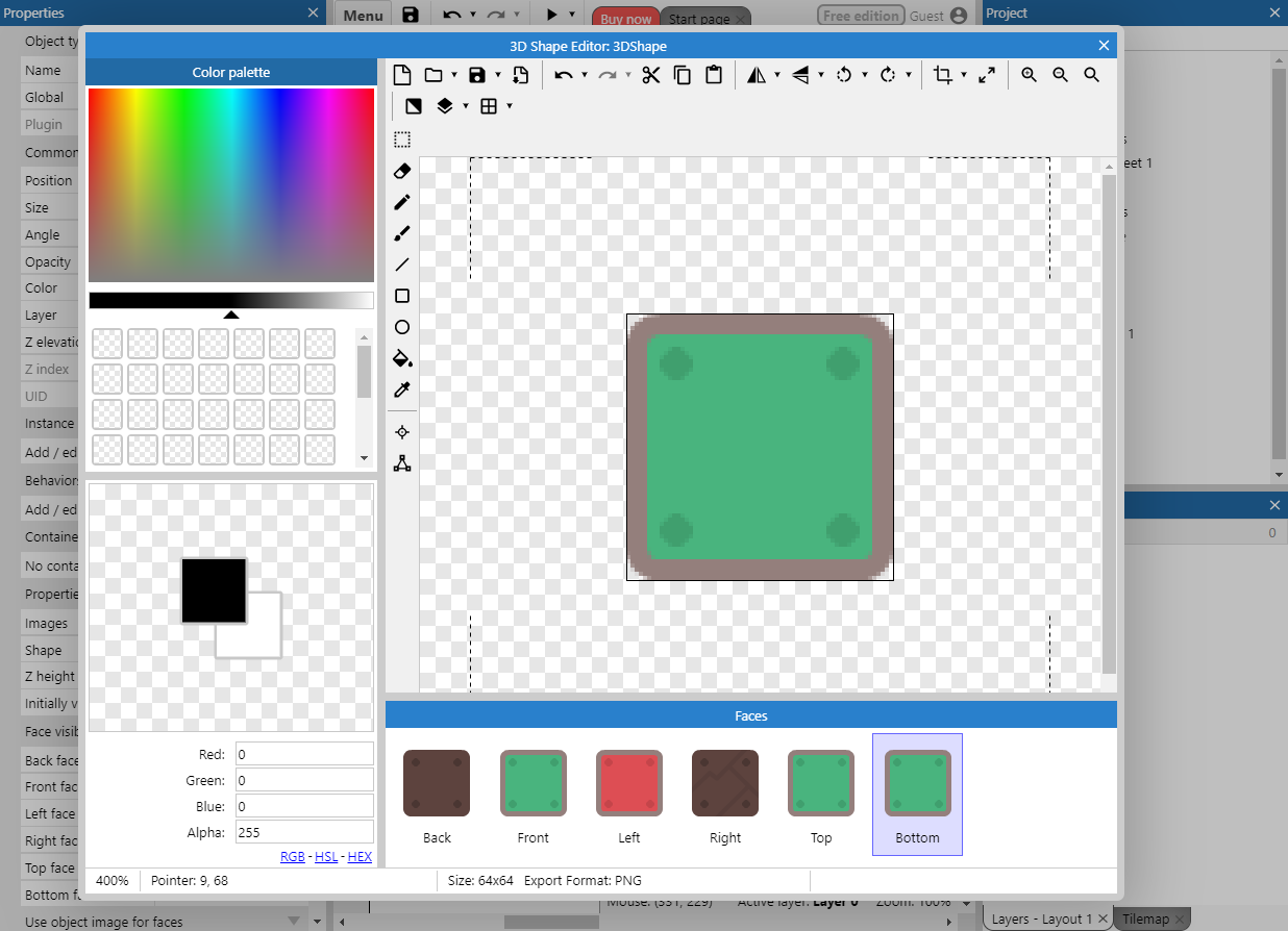 Now select your 3D block, and add the "Solid" behaviour. This means that the platform is solid, so the player will be able to walk on top of it!