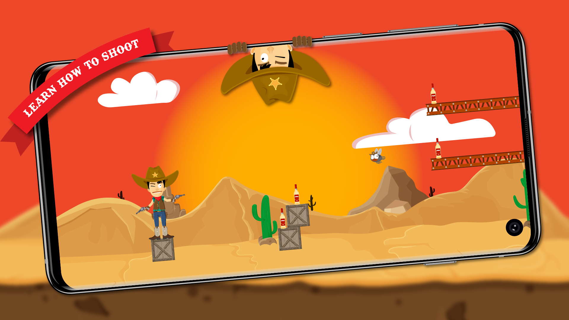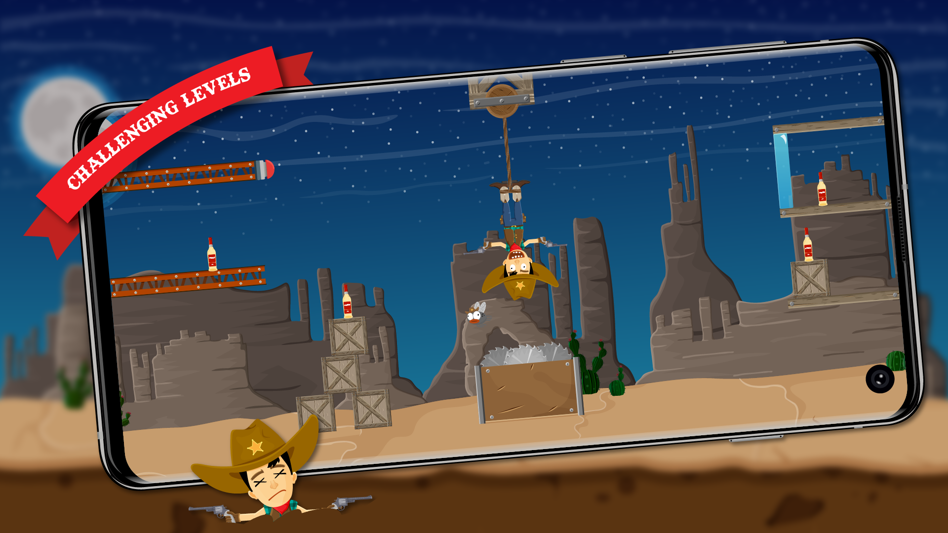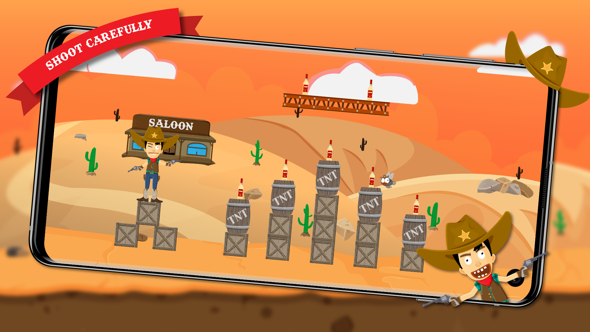 Are you ready to become the best cowboy of the world? Solve the hardest levels, show off your deadly accuracy and take aim at the bottles. But be careful! If you miss you will die.