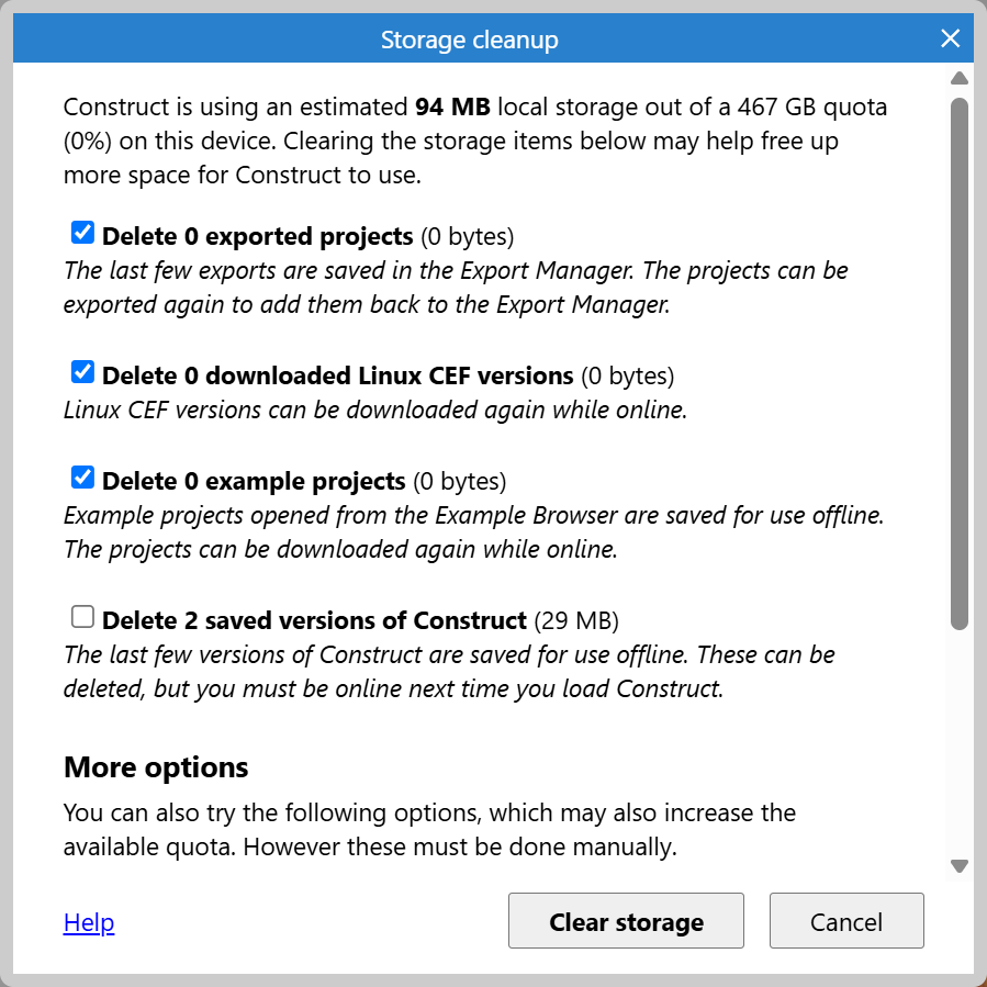 The items listed in the dialog include explanations of what they are and the consequences of deleting them. There is also additional advice at the bottom of the dialog with additional things you can do to free up space which you will have to do separately since Construct cannot do them for you. Some browsers set a storage quota based on a proportion of the available disk space, so in general anything else that frees up storage space on the device should increase the quota available to Construct.
