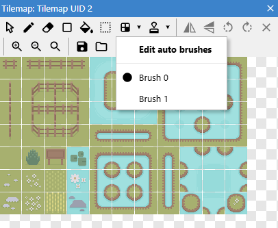 There are three types of brushes supported, the 16 tile auto tiling brush, the 47 tile auto tiling brush and the patch brush. Brushes are created by default with each instance of the Tilemap plugin. The default brushes are setup to work correctly with the default tilemap image.
